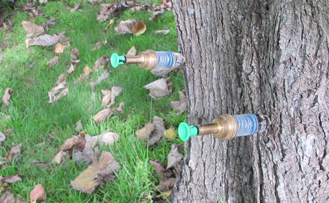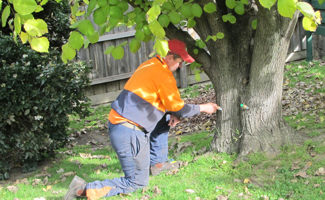 Climbing High Tree Services provides safe treatment for Elm trees suffering damage from the Elm Leaf beetle. A specialized injection is carefully administered into the stem of the infected Elm. The injection contains an insecticide that can last up to 3 years, significantly reducing the effect of Elm Leaf Beetle. It is the safest method of treatment, with no off target effects. Treatment of the tree occurs between Spring (when flower and leaf buds first appear) through to early Autumn (before leaves drop).